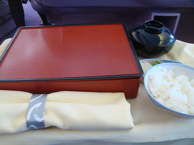 日式便當看起來很美,吃起來也算是好吃的飛機餐,冰的黃攖吟釀很順口,吃完新鮮水果以後,就送上一杯熱的綠茶搭配和菓子,真是心滿意足!斜對面的一位年輕旅客,已經開始敷臉小寐了.